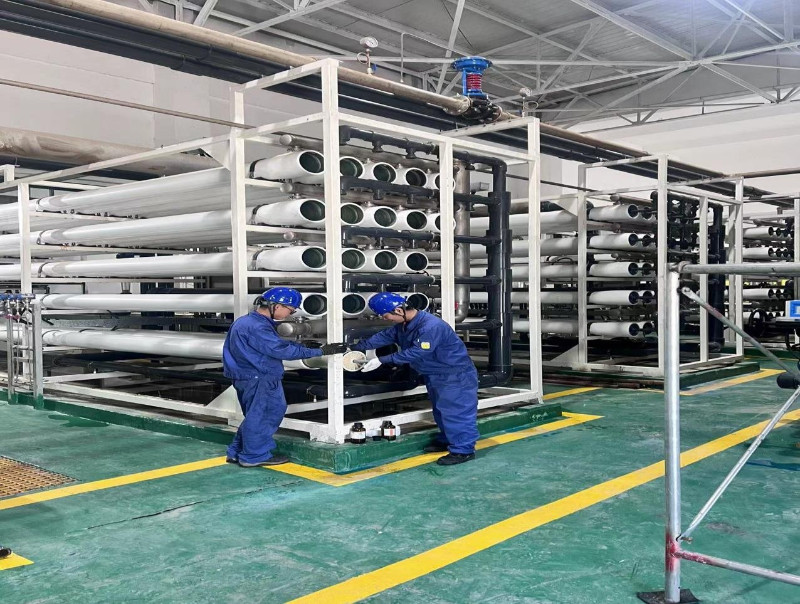 一號一級反滲透設備從今年4月開始,就出現(xiàn)除鹽率下降的現(xiàn)象,經過探針實驗分析膜柱故障,在對調更換一二號反滲透膜柱沒有明顯效果后,確認膜柱除鹽率降低。由于相關備件停機時間等因素,機務檢修人員沒有機會處理該故障。8月2日該裝置具備臨時停機檢修條件,技術裝備部主動聯(lián)系處理該故障,計劃用僅有的四天將126支膜柱從高3米長6米的21組膜殼中取出、處理故障及新膜柱的編號登記安裝恢復和調試。雖然“時間短、任務重”,但為了確保不影響裝置開工,公司領導高度重視并要求加快檢修進度,力爭在3天后進行調試試運行。面對緊迫的工作任務,機務檢修班的員工們盡顯擔當,頂著作業(yè)環(huán)境高溫潮濕,在檢修現(xiàn)場進行高強度作業(yè),悶熱的環(huán)境讓每個人汗如雨下,主動加班加點投身到檢修工作中,最終如期并保質保量的對設備進行了恢復。此次檢修,贏得了運行人員的一致好評。