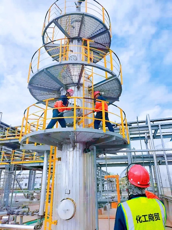 “高處作業(yè)的防范措施有哪些?堿液卸車前準備要做到哪些?監(jiān)護人員的責任是否熟知……”10月4日,在化工園區(qū)物流園貨場各個施工現場,石化集團化工商貿公司值班領導及技術人員來到施工現場,進行例行巡檢。