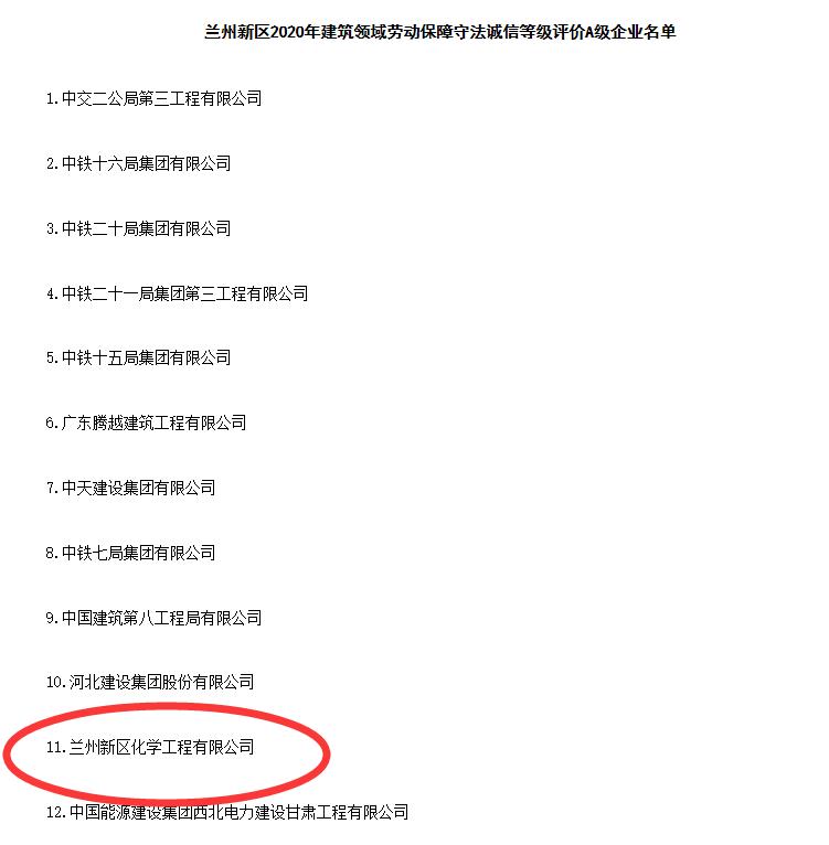 近日,從蘭州新區(qū)民政司法和社會(huì)保障局獲悉,蘭州新區(qū)化學(xué)工程有限公司被認(rèn)定為蘭州新區(qū)2020年建筑領(lǐng)域勞動(dòng)保障守法誠(chéng)信等級(jí)評(píng)價(jià)A級(jí)企業(yè),成為蘭州新區(qū)唯一一家獲得此榮譽(yù)的新區(qū)國(guó)有企業(yè)。